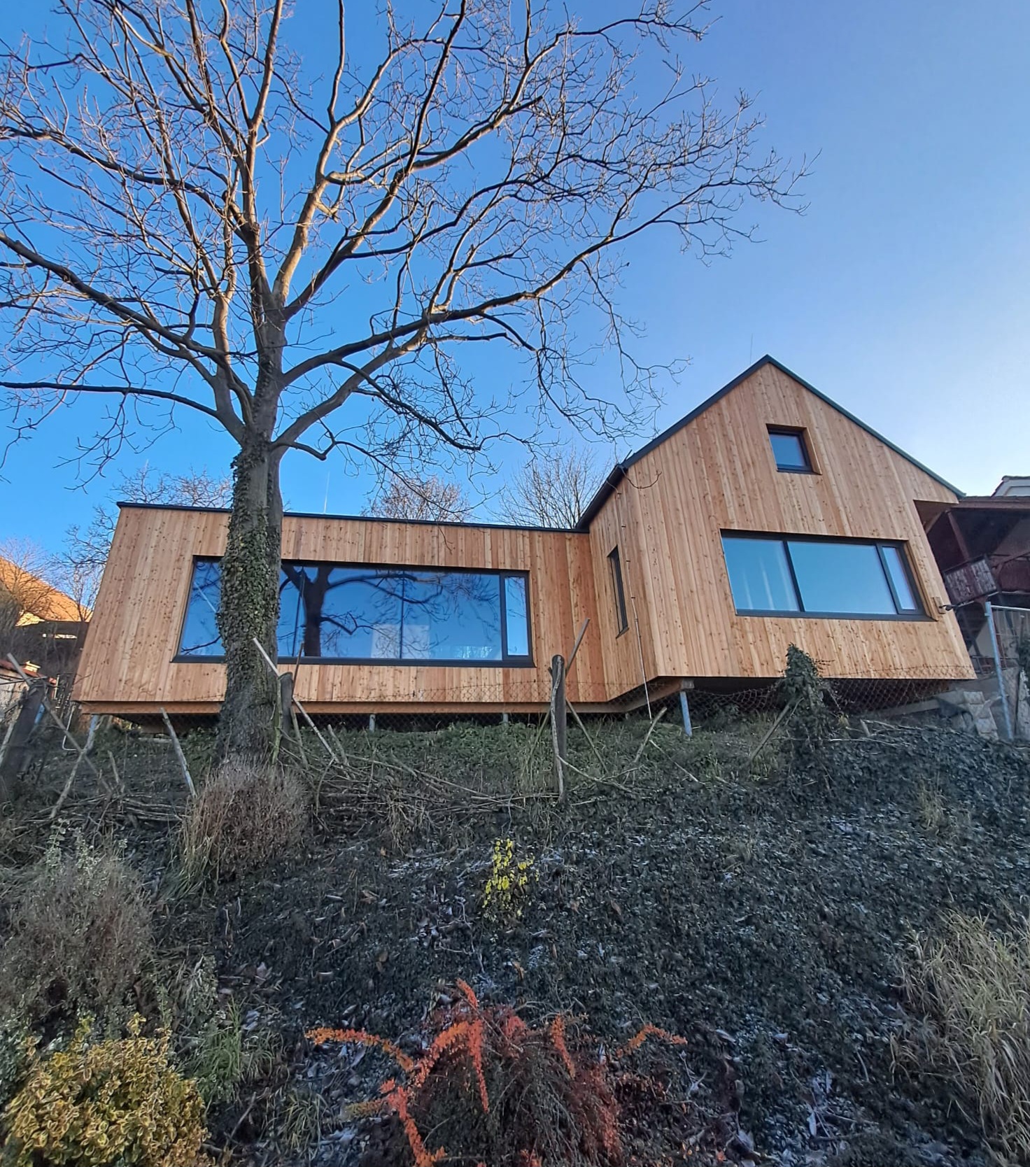 Navštívili jsme dřevostavbu, kterou jsme realizovali subdodavatelsky během loňského září a října. Tato stavba je z CLT panelů, ale se stejnými modřínovými prkny bez úpravy, situována na okraji Prahy.