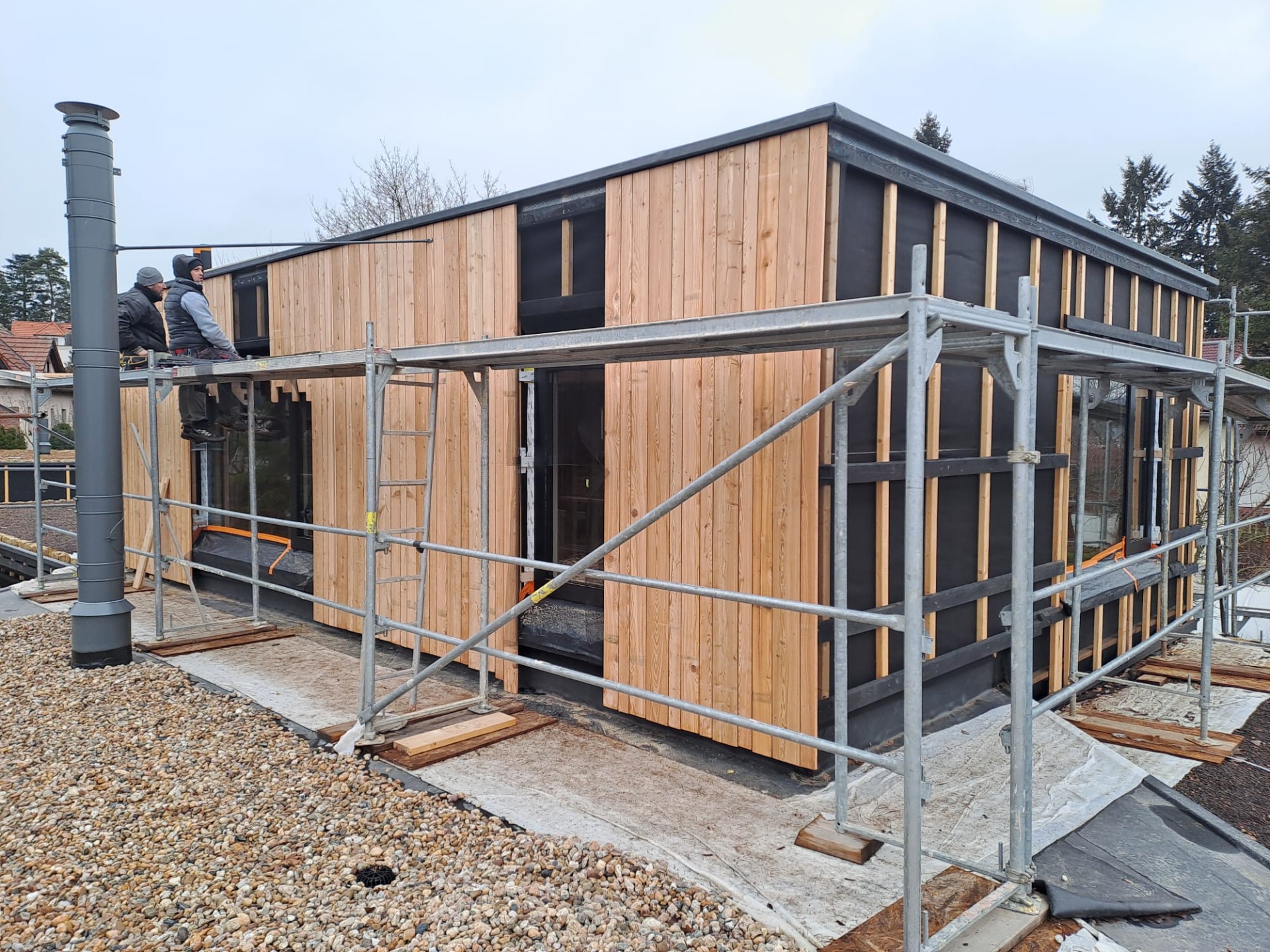 Po instalaci difúzní folie, roštů, kontralatí, ploché střechy s kačírkem, prostupů a parapetů se věnujeme modřínové fasádě.